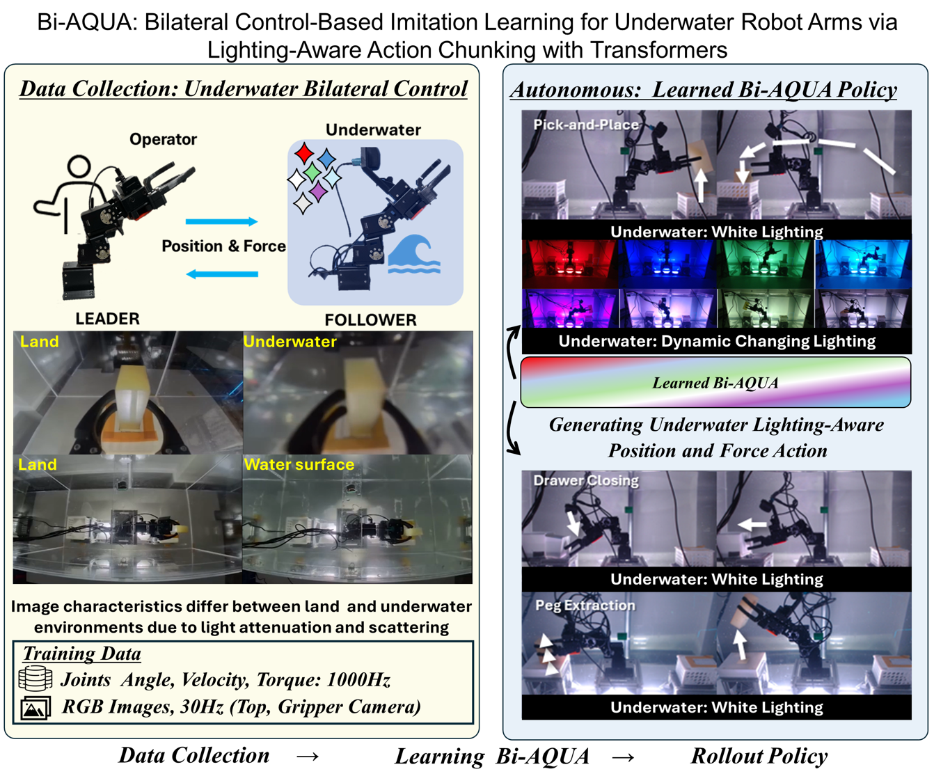 Summary: Bi-AQUA is the first framework to simultaneously address all three gaps: (i) underwater deployment with autonomous policy learning and explicit lighting modeling, (ii) bilateral control-based imitation learning with vision for underwater manipulation, and (iii) hierarchical lighting modeling that adapts both perception and control to dynamic underwater illumination.