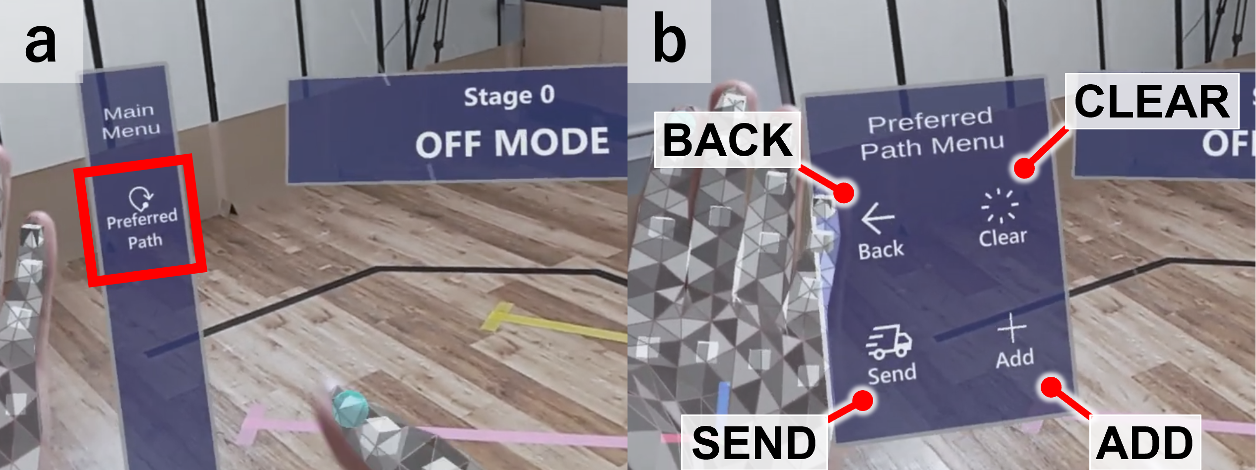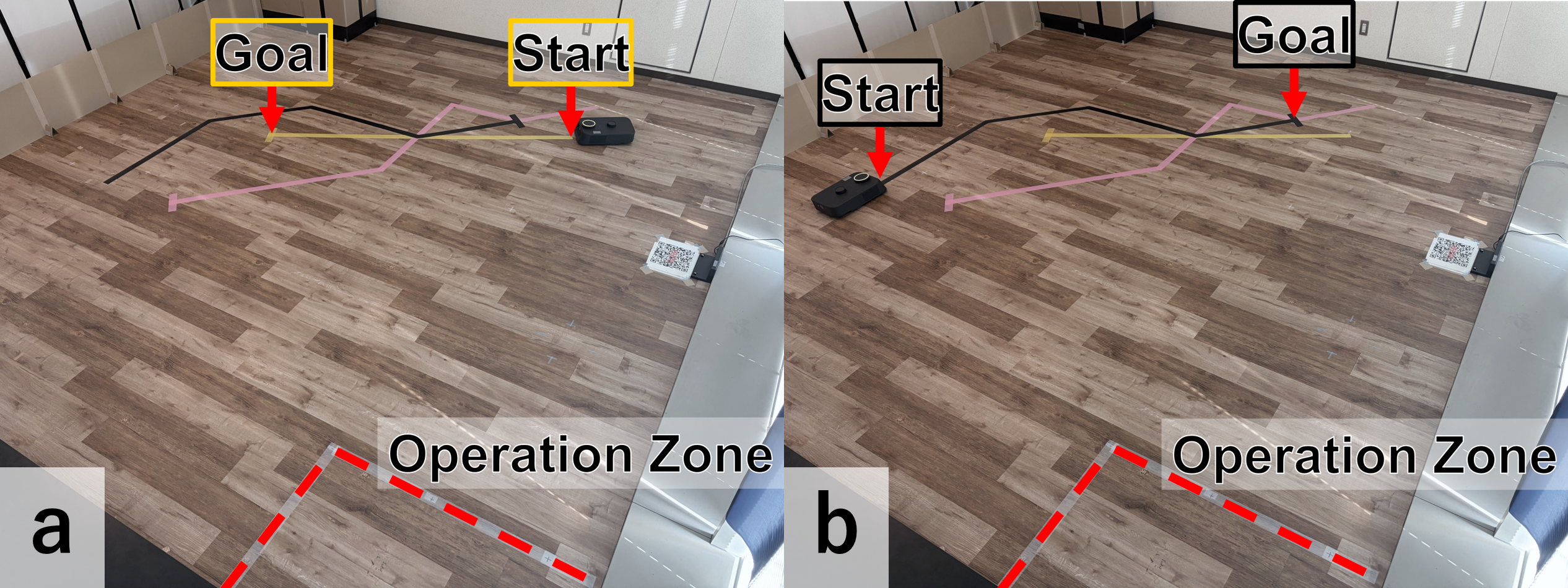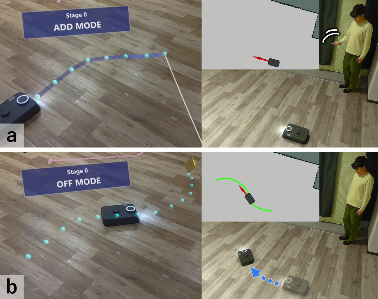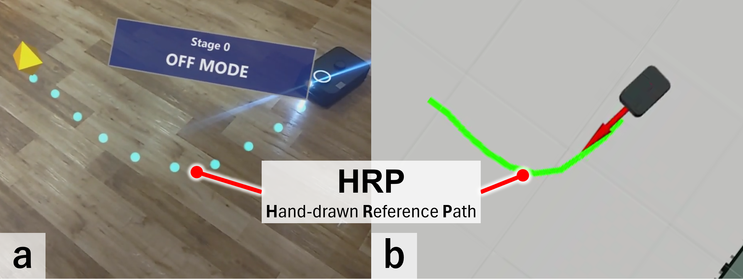 MRReP overview: (a) drawing an HRP on the floor in MR; (b) autonomous navigation along the specified path.