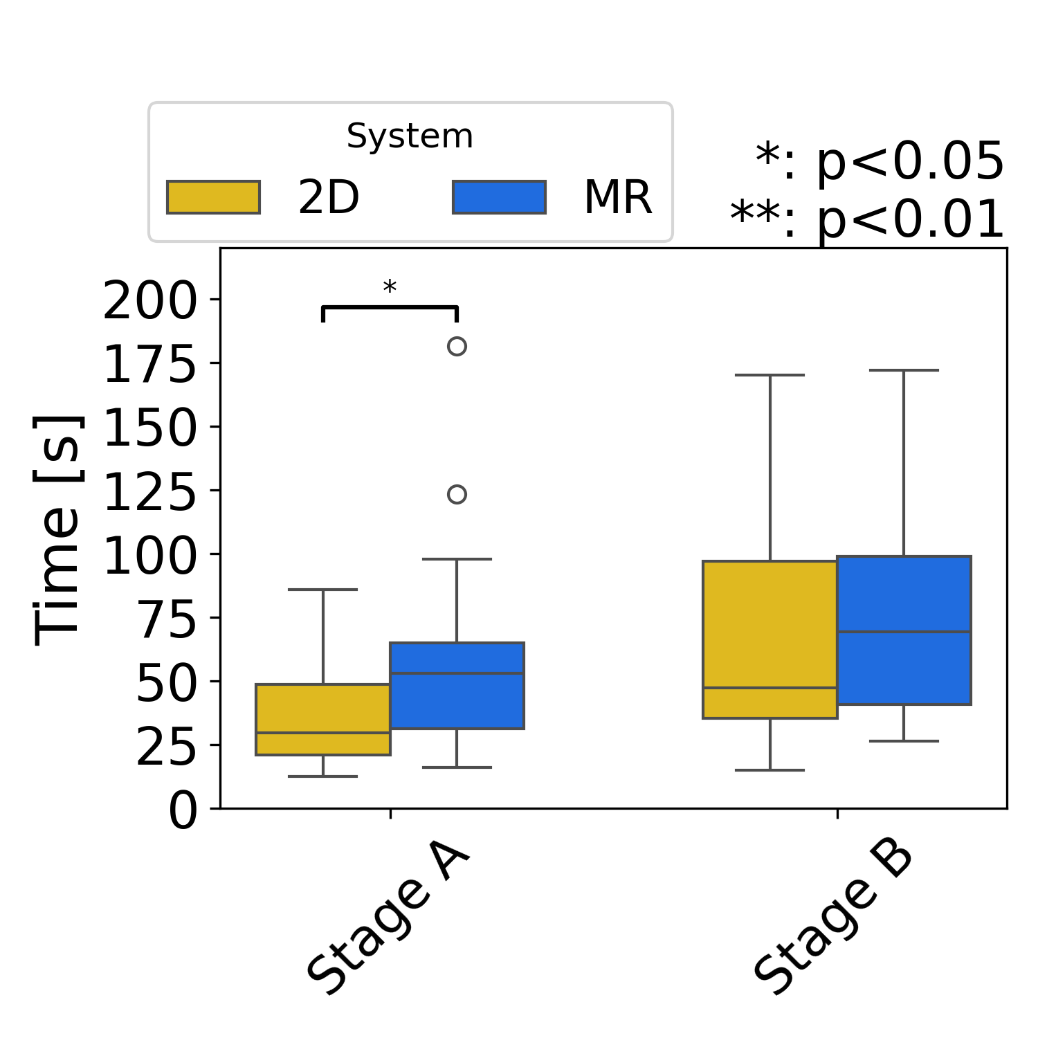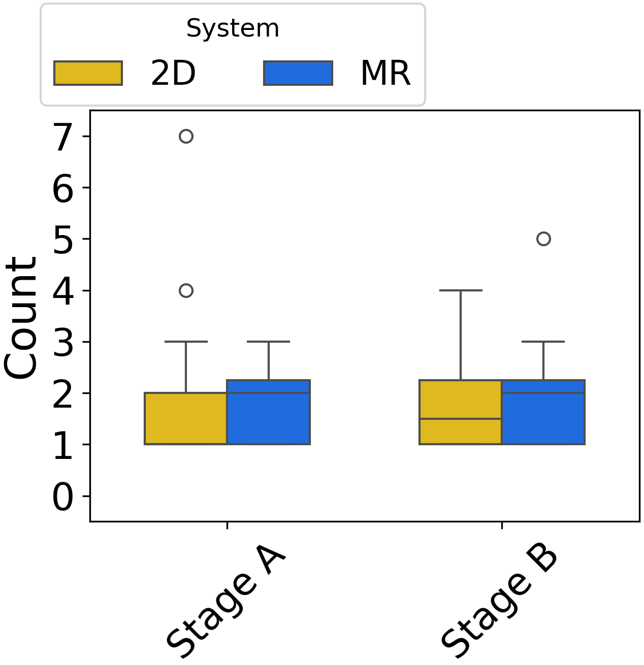 The number of drawing attempts did not differ significantly between conditions. Task completion time tended to be longer with MR, possibly due to finer adjustment and larger physical movement than mouse input.
