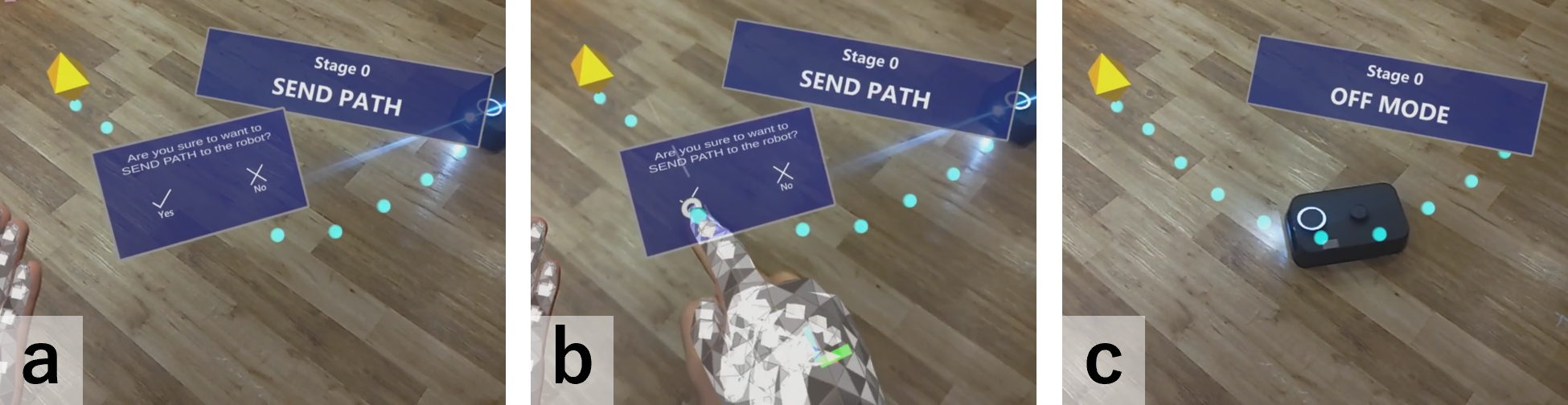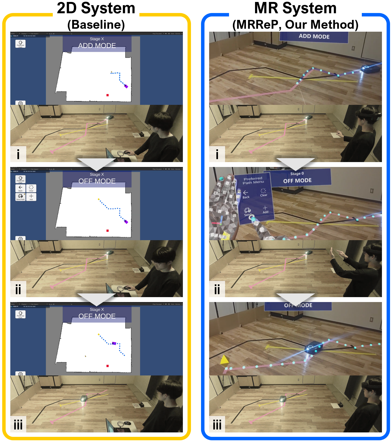 We conducted a within-subject study comparing MRReP (HoloLens 2, gesture drawing on the floor) with a 2D baseline (laptop, mouse on a 2D map). Both systems offered ADD, CLEAR, and SEND and shared the same navigation pipeline after submission.