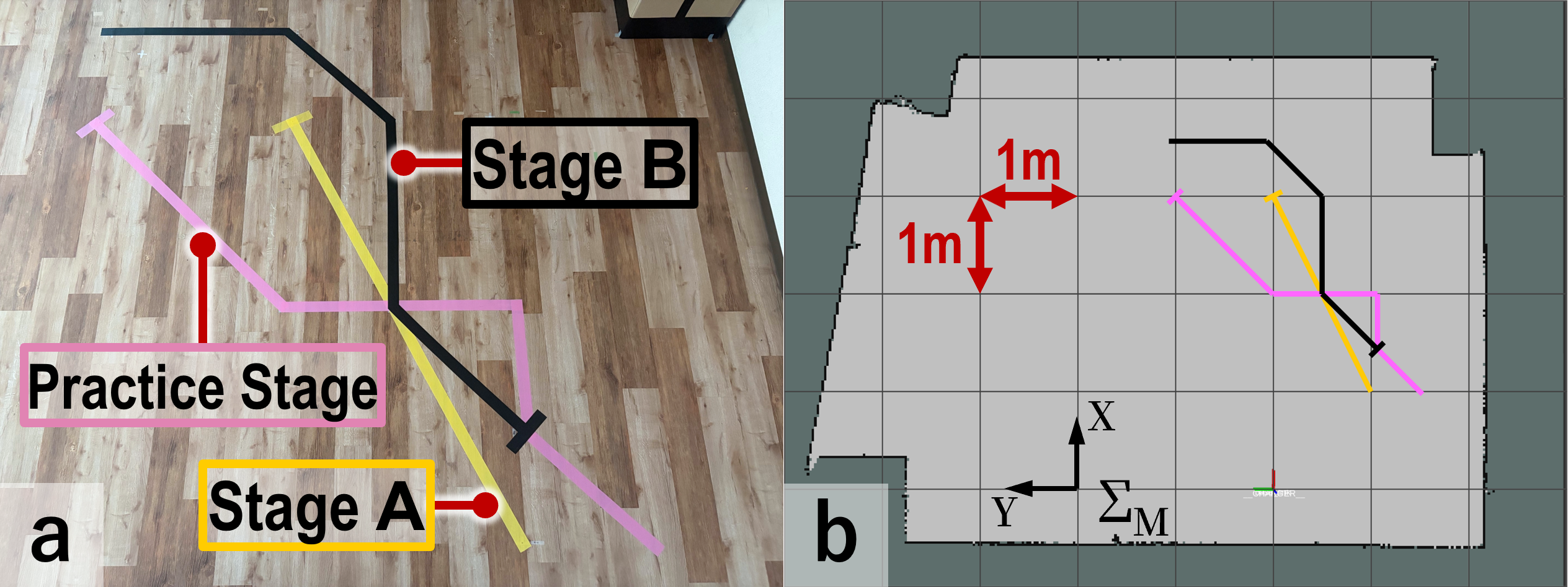Experimental environment: Stage A (straight), Stage B (piecewise linear with 45° turns).