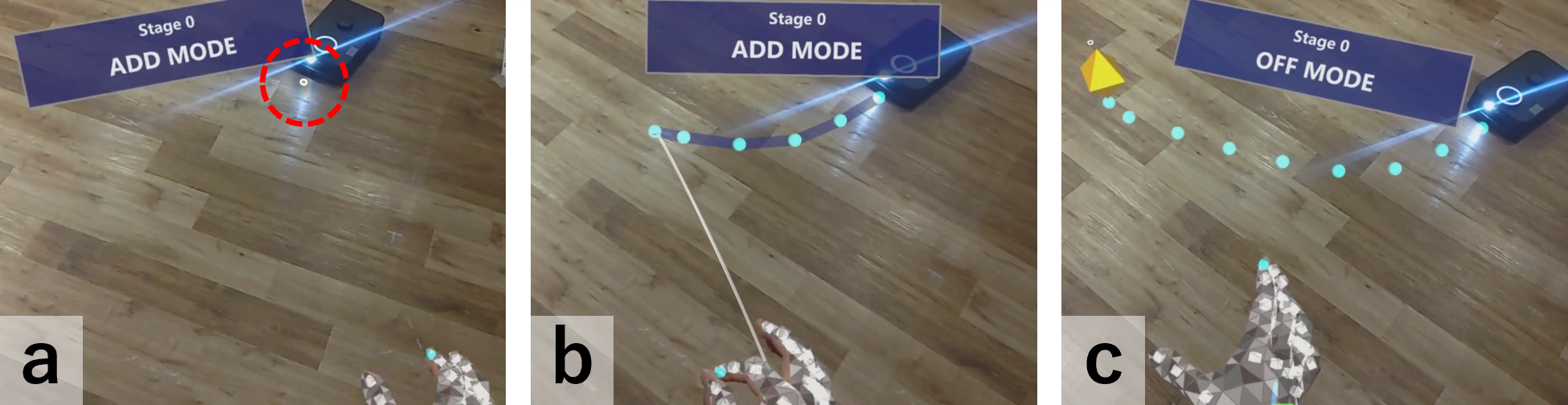 In ADD mode, a floor cursor appears when the user extends the hand; maintaining a pinch gesture draws the HRP as a sequence of waypoints. Releasing the pinch completes the path and places a goal pin at the endpoint. The system assigns a unique ID and stores the coordinate sequence in the database.