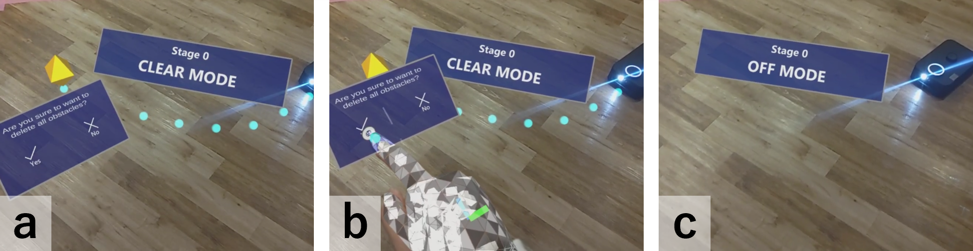 CLEAR removes all HRPs. A confirmation popup prevents accidental deletion; on confirmation, scene objects and database records are cleared and the system returns to OFF mode.