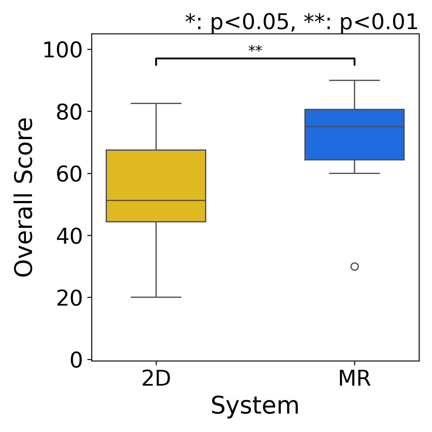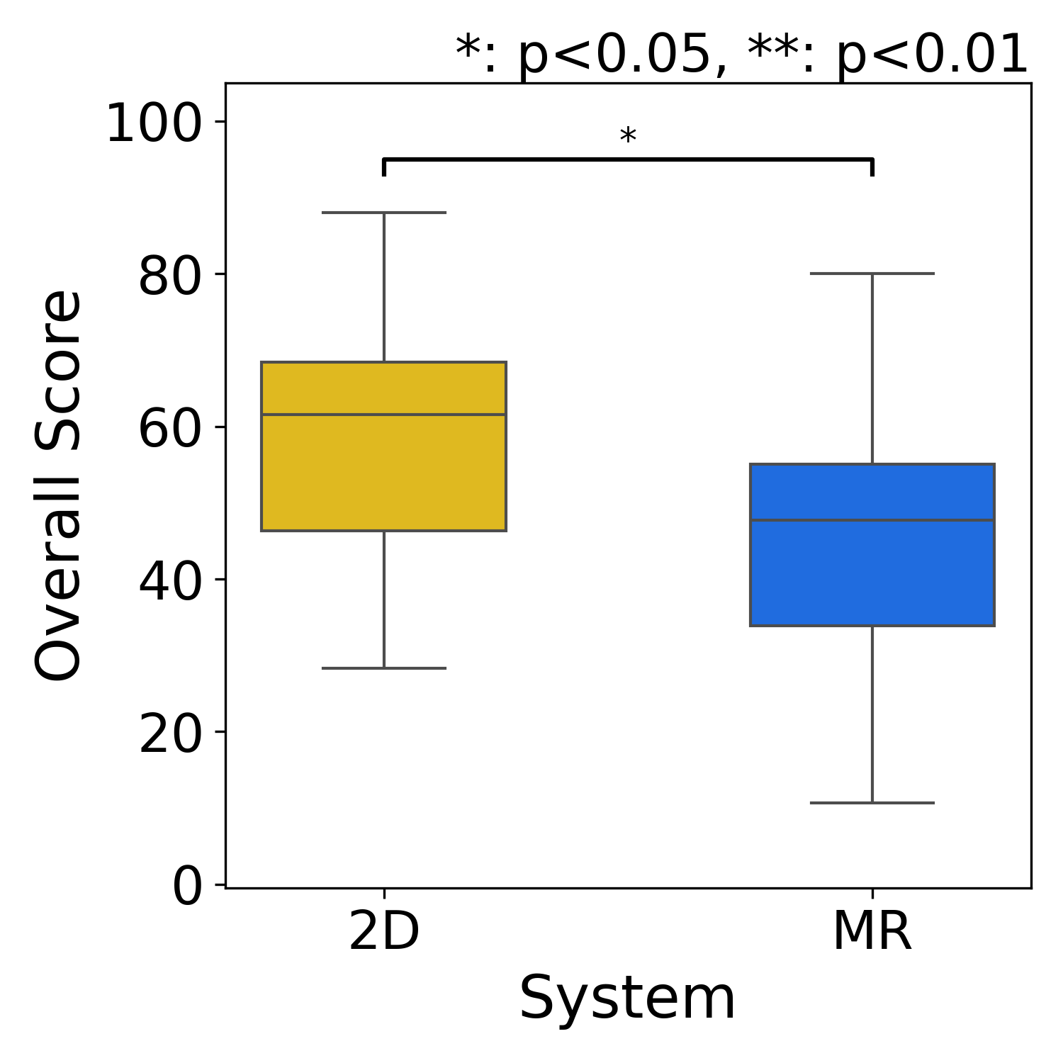 MR yielded higher SUS scores and lower NASA-TLX scores than the baseline. Participants also reported MR-specific issues such as arm fatigue and gesture misrecognition.