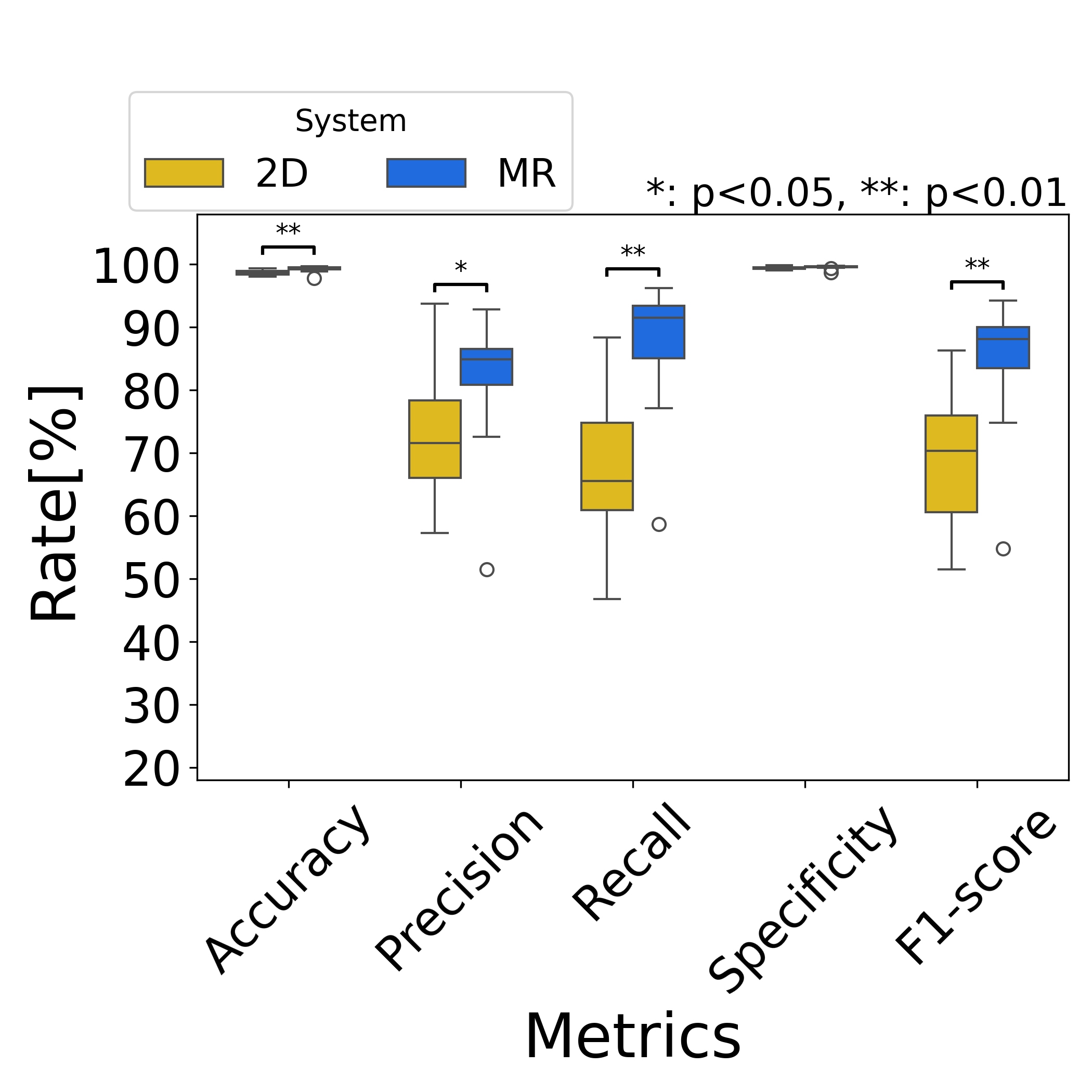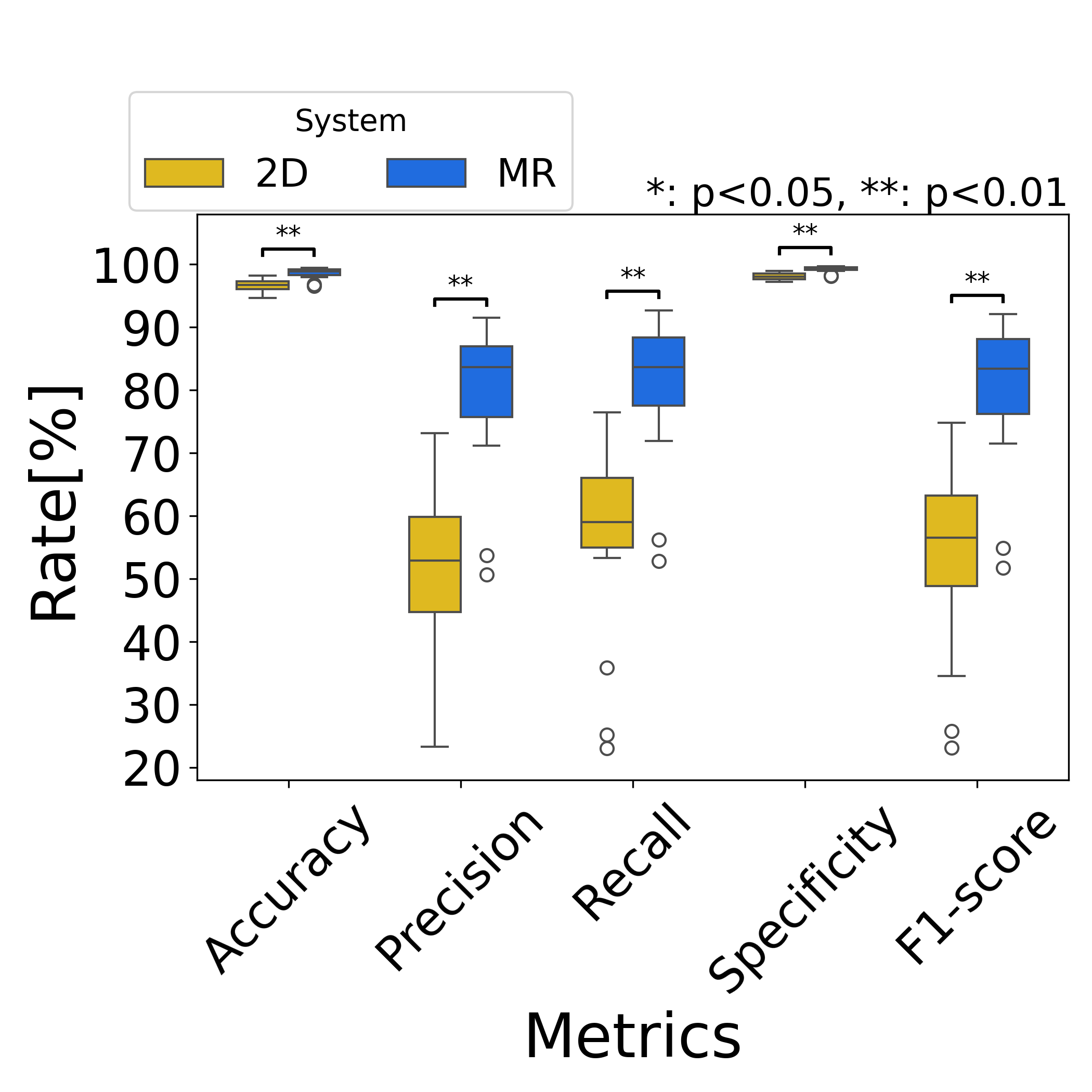 MR achieved higher precision and recall than the 2D baseline (e.g., precision 84.9% vs. 71.6% in Stage A; recall 91.6% vs. 65.5% in Stage A), with strong gains especially in the more complex Stage B. Wilcoxon signed-rank tests were used for statistical comparison.