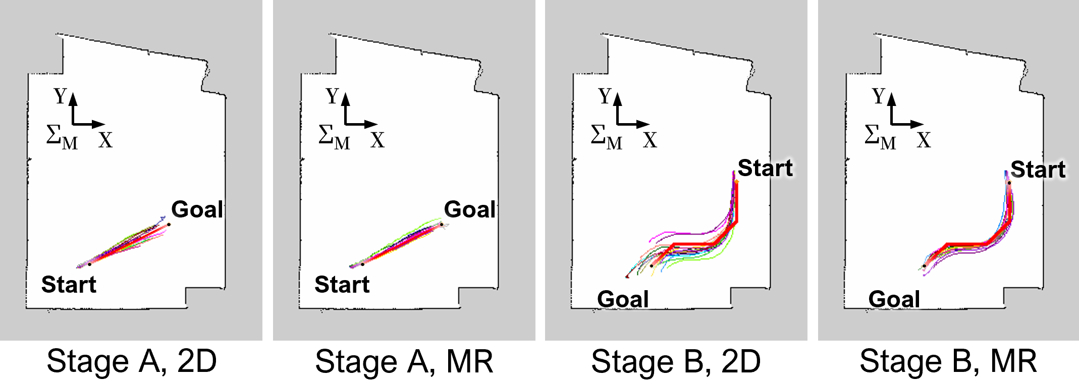 The 2D condition often showed growing deviation from GT with distance from the start; MR showed smaller deviations and lower inter-participant variance, including for Stage B.