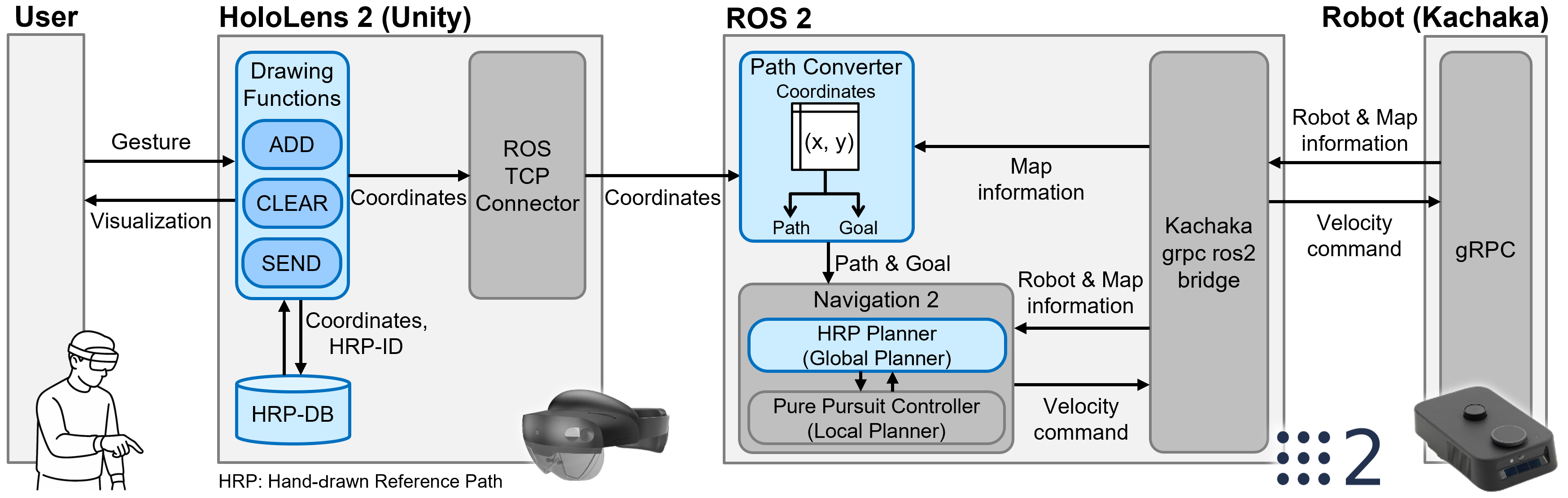 System architecture: HRP stored on HoloLens 2 is sent to ROS 2, converted to a global path and goal pose, and used in Navigation2.