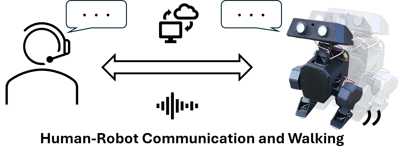 Concept of SpeeLo: a bipedal robot engaged in speech interaction while walking.