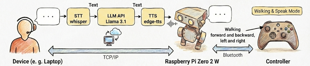 We extend the open-source Open Duck Mini locomotion stack without altering its walking behavior, using a speech server on the robot and a speech client on an external device. The locomotion module launches the speech server in a background thread within the same process so the main control loop does not contend with speech-related compute on a single thread.
